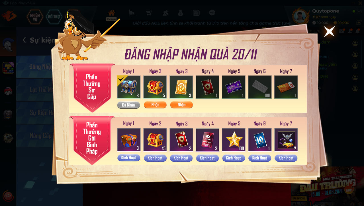 + Tài khoản đã nhận Phần Thưởng Sơ Cấp ngày 1, 2 sau đó kích hoạt gói -> Nhận thêm Phần Thưởng Binh Pháp ngày 1, 2 và các ngày sau đó khi tiến hành đăng nhập