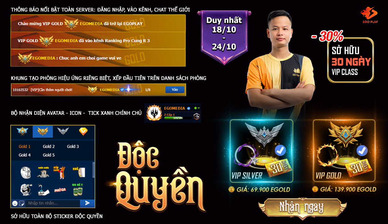Từ ngày 18/10 - hết 24/10/2021, chỉ với 69.900 EGold và 139.900 EGold (Giảm 30%) bạn sẽ sở hữu cực hời 30 NGÀY VIP CLASS độc quyền với bộ nhận diện và trạng thái hiển thị đẳng cấp, khác biệt.