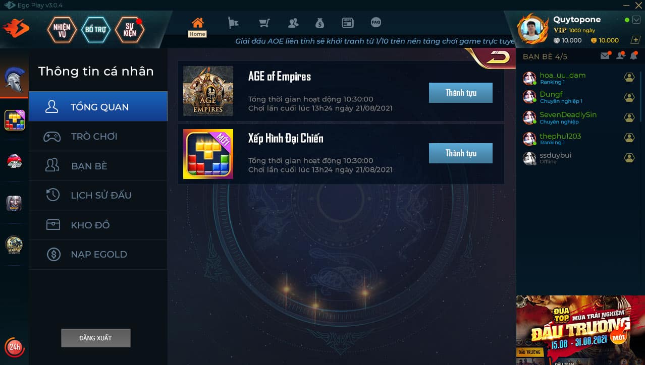 1 sự thay đổi lớn được đội ngũ EGOPLAY làm rất chăm chút và kĩ lưỡng, giúp cho tài khoản cá nhân trở nên bắt mắt hơn nhưng vẫn thể hiện được chi tiết các thông tin quan trọng. Tại giao diện tổng quan, các tựa game trên nền tảng được phân tách riêng biệt, hỗ trợ người chơi nắm được thành tích cá nhân một cách trọn vẹn.